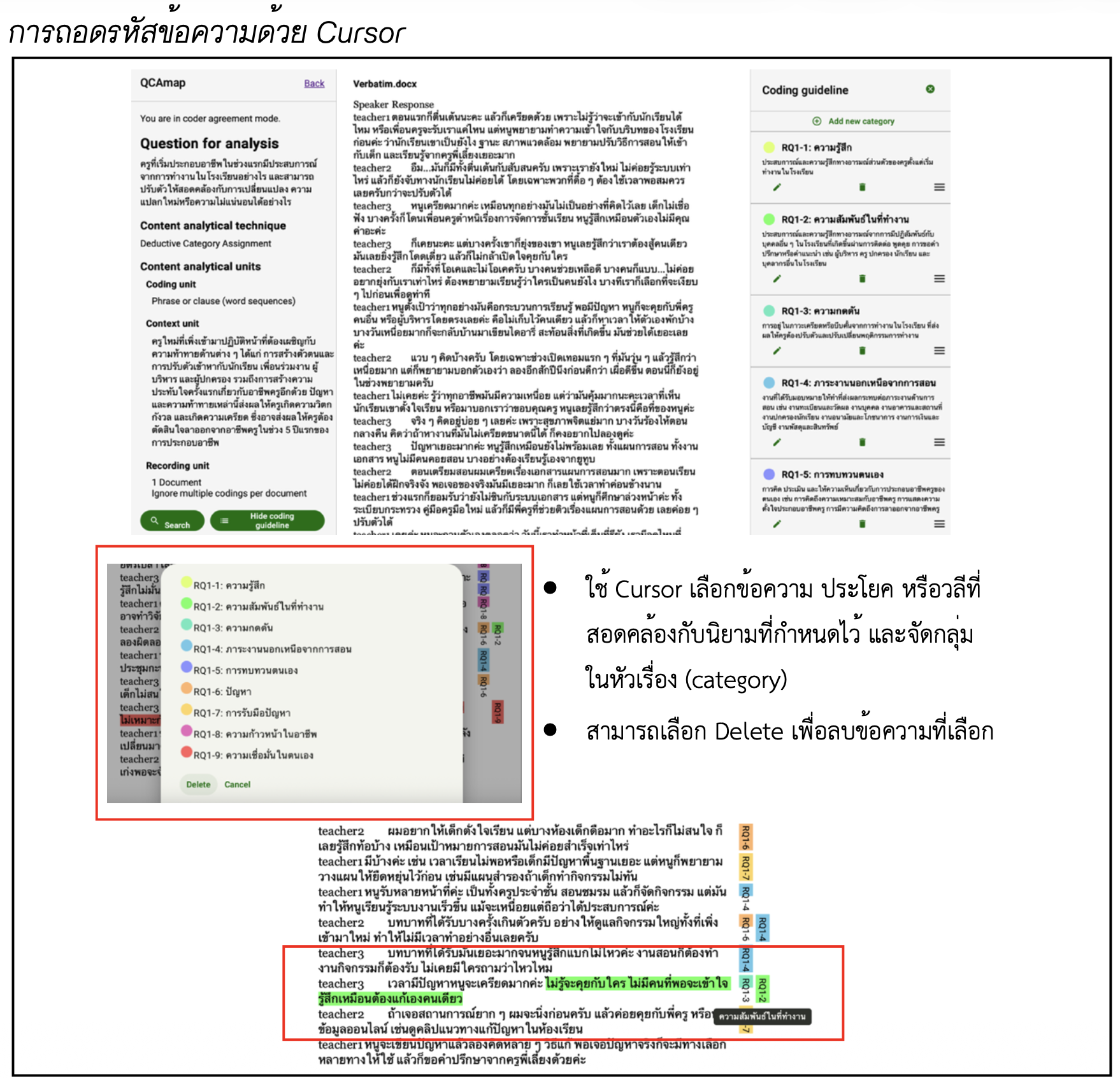Qualitative data analysis is often complex and requires the researcher’s meticulous attention in organizing, interpreting, and systematically summarizing data. QCAmap was developed as a tool for content analysis to assist with coding, decoding, and presenting analytical results derived from qualitative data. To demonstrate its practical application, this article presents a case study generated using ChatGPT, in which the author created a simulated scenario where a researcher interviews teachers who have recently been appointed during their first three years of work. The objective of this article is to introduce and demonstrate the step-by-step use of QCAmap for content analysis. It presents the initial setup and methodological framework leading to the development of categories, definitions, anchor examples, and coding rules, which are then used to decode interview data and display the results in a frequency table of categories and excerpts. The trial use of QCAmap reveals that the platform effectively manages textual data, is user-friendly, and supports the Thai language. Therefore, it is suitable for those interested in conducting qualitative content analysis and learning to use systematic analytical tools.